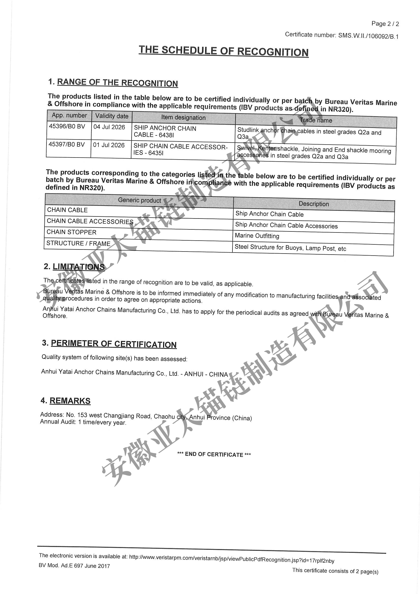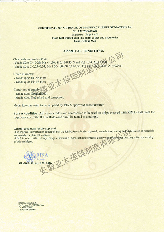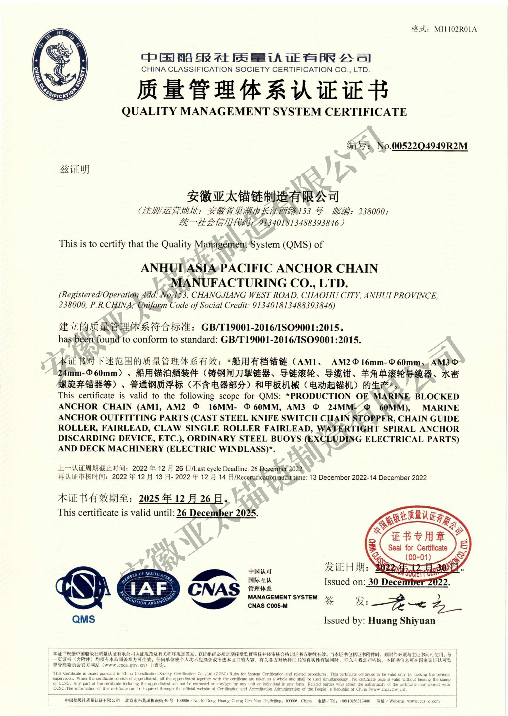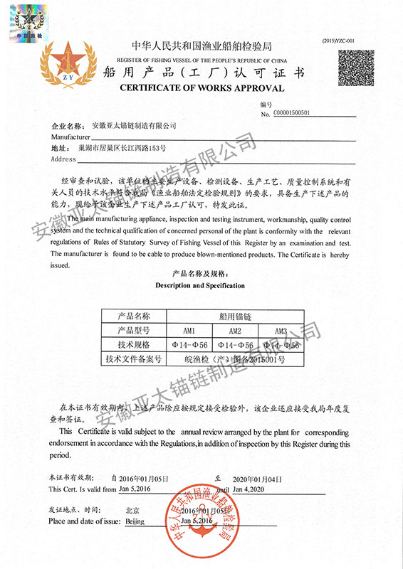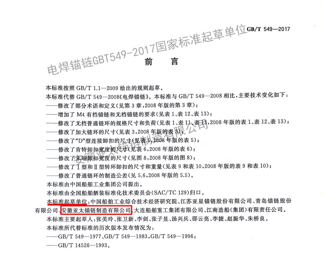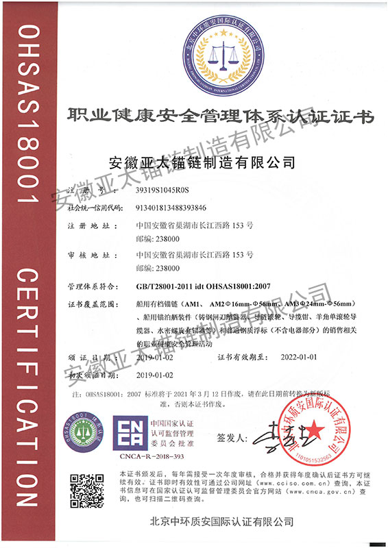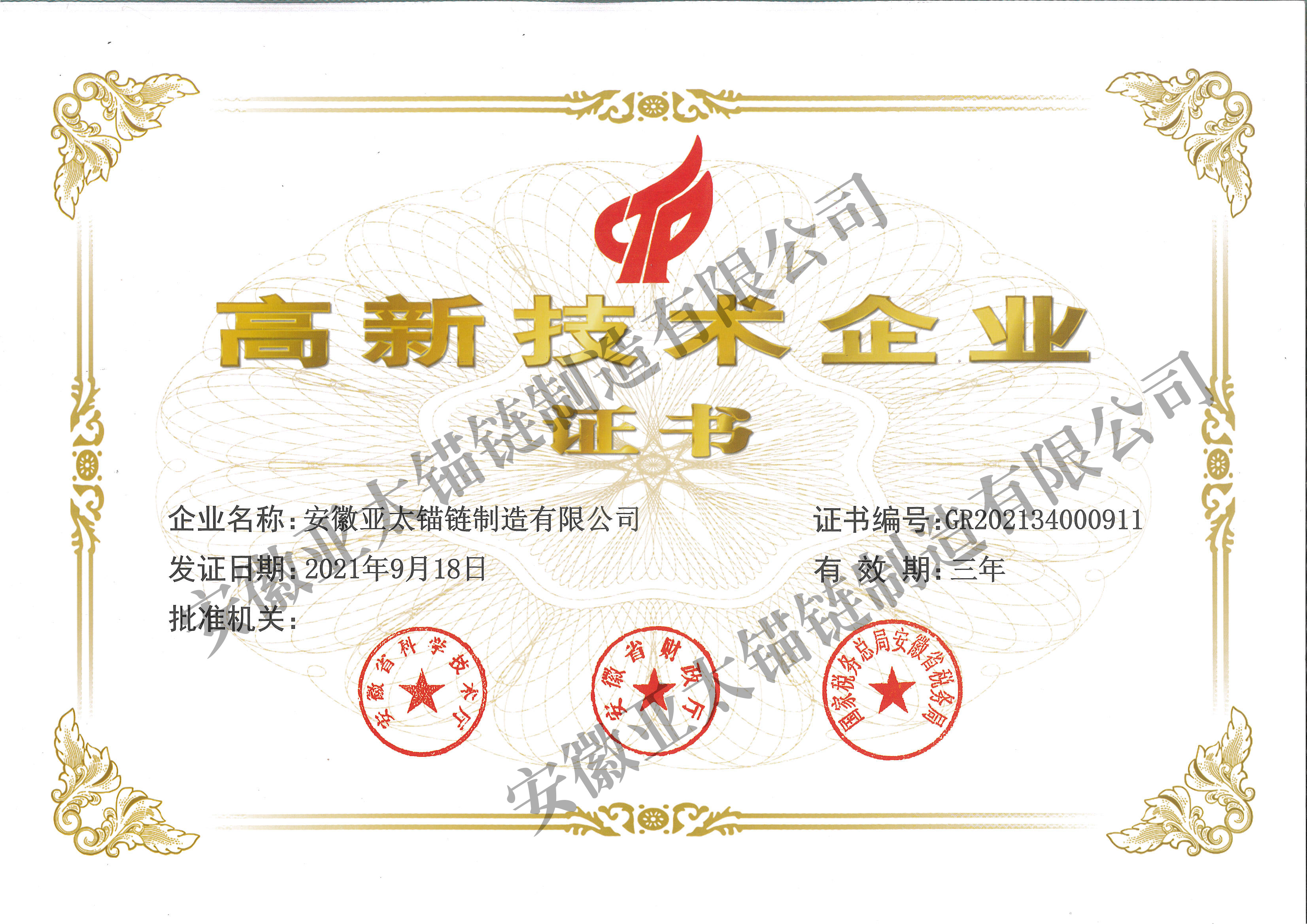 安徽亞太錨鏈制造有限公司是國家高新技術(shù)企業(yè),也是國家GB/T 549-2017《電焊錨鏈》標準的起草和制定單位之一。公司旗下設(shè)有錨鏈分廠、浮標分廠、舾裝件分廠等多個分廠。公司專業(yè)從事φ12.5mm-φ107mm二、三級船用錨鏈、浮標錨鏈、錨鏈附件,錨、船舶曬裝產(chǎn)品、航標、系船浮、船型標、多種規(guī)格海洋監(jiān)測浮標及航標燈等產(chǎn)品的生產(chǎn)、安裝和服務。目前公司的產(chǎn)品銷往全國各地船廠、碼頭、航標處、航道局、海洋局,并已走上國際市場,如東南亞、中東、歐美等國家。